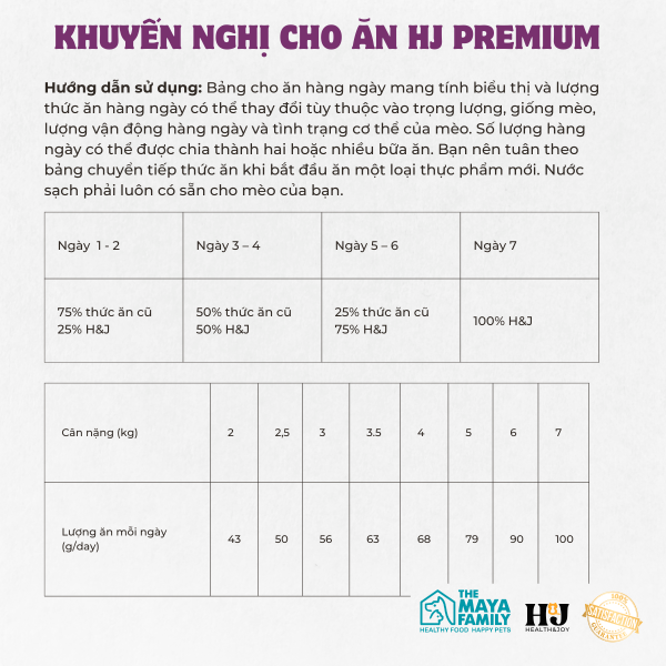 Cho mèo của bạn ăn theo bảng cho ăn hàng ngày được khuyến nghị. Bảng cho ăn hàng ngày mang tính biểu thị và lượng thức ăn hàng ngày có thể thay đổi tùy thuộc vào trọng lượng, giống mèo, lượng vận động hàng ngày và tình trạng cơ thể của mèo. Số lượng hàng ngày có thể được chia thành hai hoặc nhiều bữa ăn. Bạn nên tuân theo bảng chuyển tiếp thức ăn khi bắt đầu ăn một loại thực phẩm mới. Nước sạch phải luôn có sẵn cho mèo của bạn.