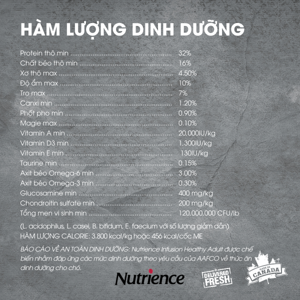 BÁO CÁO VỀ AN TOÀN DINH DƯỠNG: Nutrience Infusion Adult Indoor được chế biến nhằm đáp ứng các mức dinh dưỡng theo yêu cầu của AAFCO về thức ăn dinh dưỡng cho mèo.