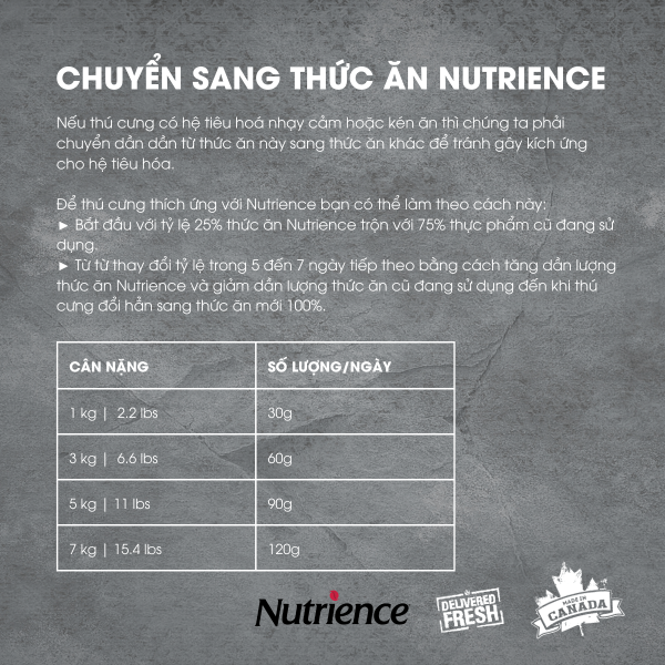► Từ từ thay đổi tỷ lệ trong 5 đến 7 ngày tiếp theo bằng cách tăng dần lượng thức ăn Nutrience và giảm dần lượng thức ăn cũ đang sử dụng đến khi thú cưng đổi hẳn sang thức ăn mới 100%.