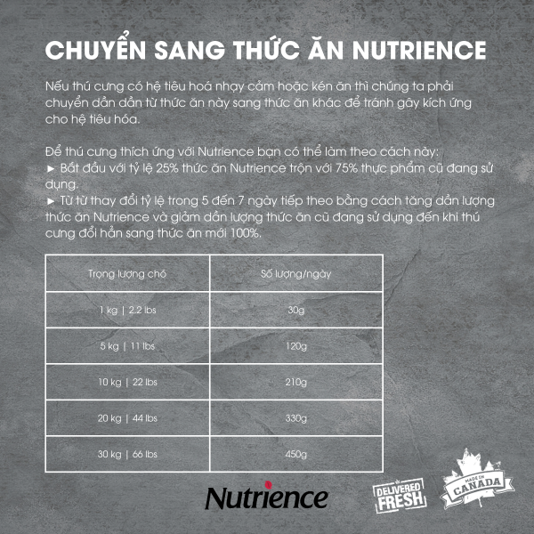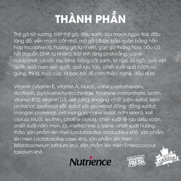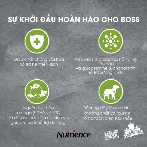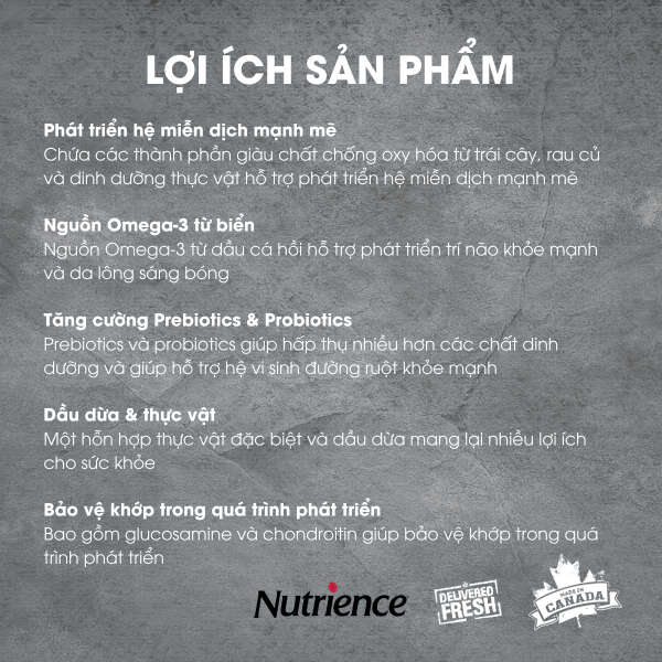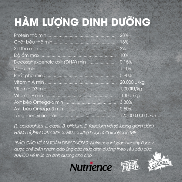 Nutrience Infusion Healthy Puppy là thức ăn dành riêng cho chó con có thành phần gồm thịt gà tươi, ngũ cốc nguyên hạt có hàm lượng đường huyết thấp, rau, trái cây và thực vật giàu chất dinh dưỡng. Rau xanh và trái cây phát triển hệ thống miễn dịch mạnh mẽ, nguồn DHA tự nhiên hỗ trợ sự phát triển của não và mắt, thức ăn có hương vị tuyệt hảo thu hút chó con biếng ăn và bổ sung thêm prebiotics và probiotics hỗ trợ hệ vi sinh vật đường ruột của chó con khỏe mạnh.