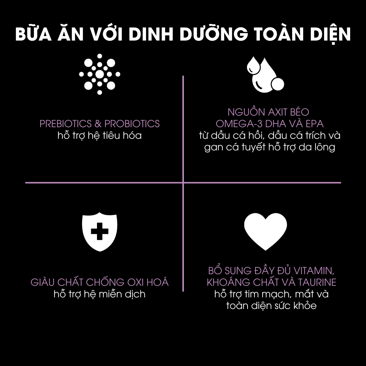 - Bổ sung prebiotics, probiotics & omega: Hỗ trợ hệ tiêu hóa, da và lông khỏe mạnh.