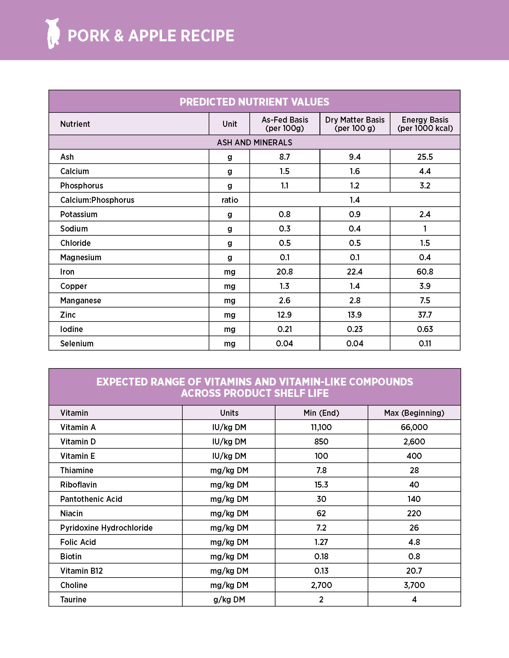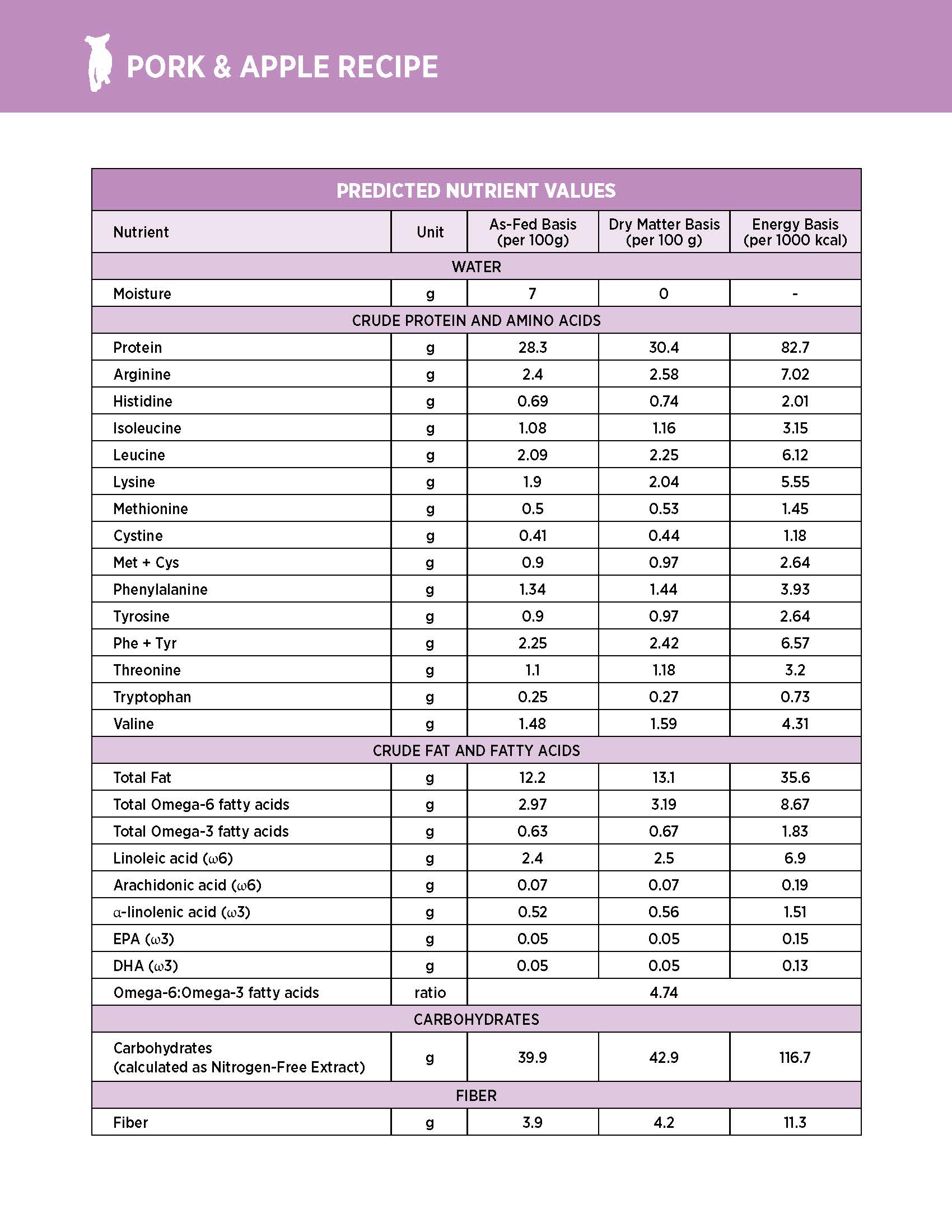 Công thức Nutrience SubZero Limited Ingredient Pork & Apple được thiết kế để đáp ứng đầy đủ các mức dinh dưỡng do AAFCO Dog Food Nutrient Profiles thiết lập cho mọi giai đoạn phát triển của chó.