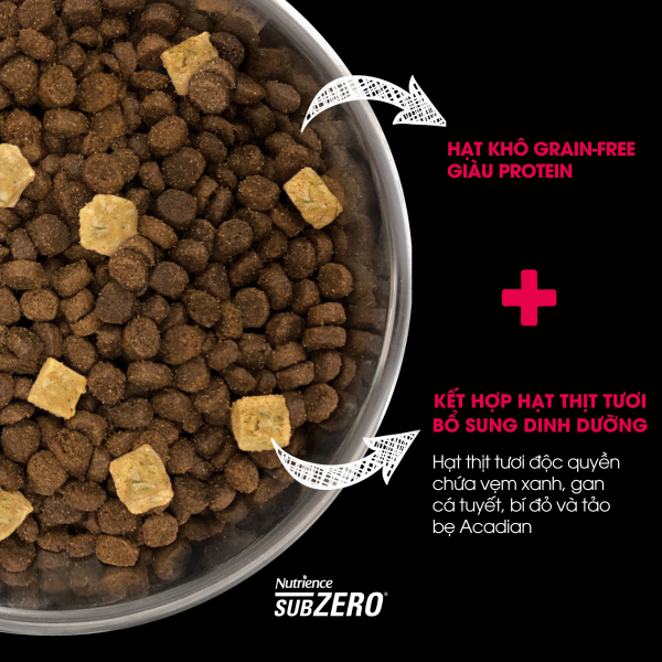 Hạt khô giàu đạm được kết hợp với Nutriboost sấy thăng hoa – những viên gan bò sống sấy thăng hoa, bổ sung vẹm xanh New Zealand hỗ trợ khớp, bí ngô tốt cho tiêu hóa, dầu gan cá tuyết giàu omega-3 và tảo bẹ Acadian tăng cường miễn dịch tự nhiên.